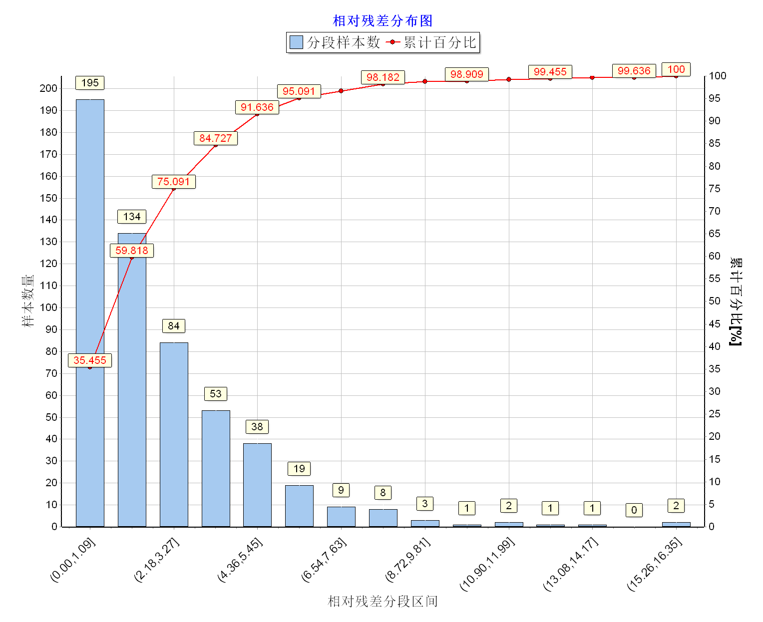 d) 残差图:绘制、查看被拟合所有数据实际值与模型预测值的相对残差(%)的分布情况;
