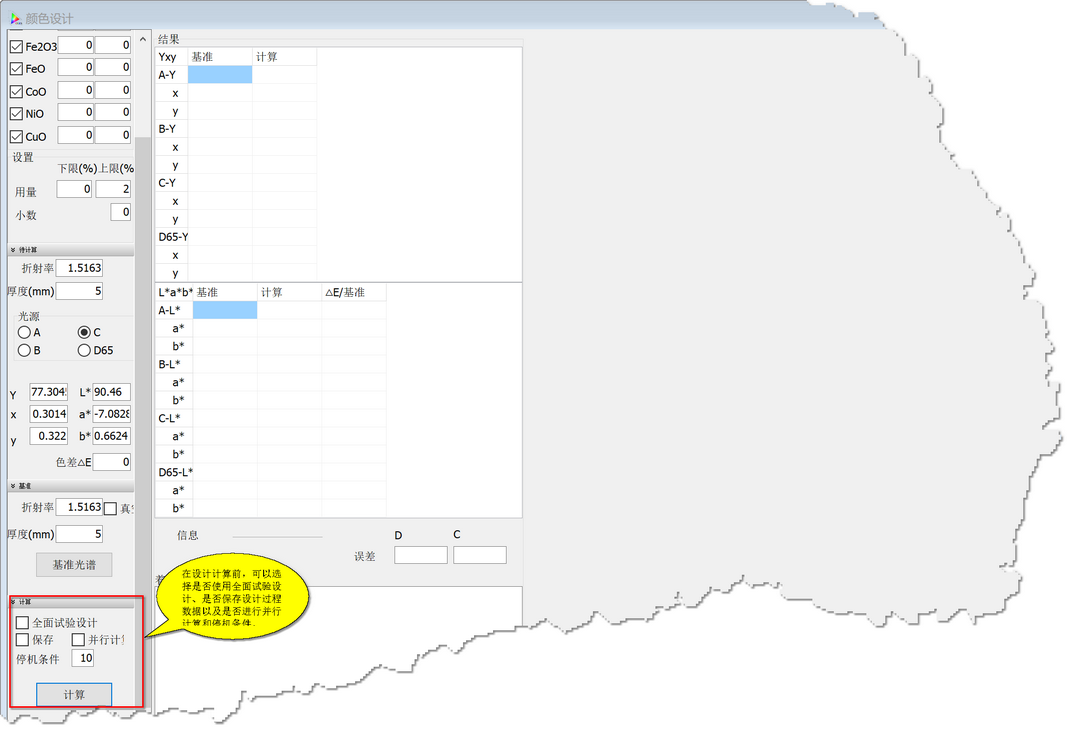 系统在进行优化设计时,提供2种试验设计方法,分别是"全面试验设计"和"正交试验设计",默认不使用全面试验设计。 当使用着色剂的种类不大于4时,系统自动使用全面试验设计方法进行设计。 "全面试验设计"运算量巨大,当使用9种着色剂计算时,计算的着色剂组合数可能会超过100万,相应耗费的计算时间也变长,运算对内存的需要量急剧上升。 当设计色差结果不能满足要求时,可使用勾选"全面试验设计",计算机将花费更多时间进行大量运算。